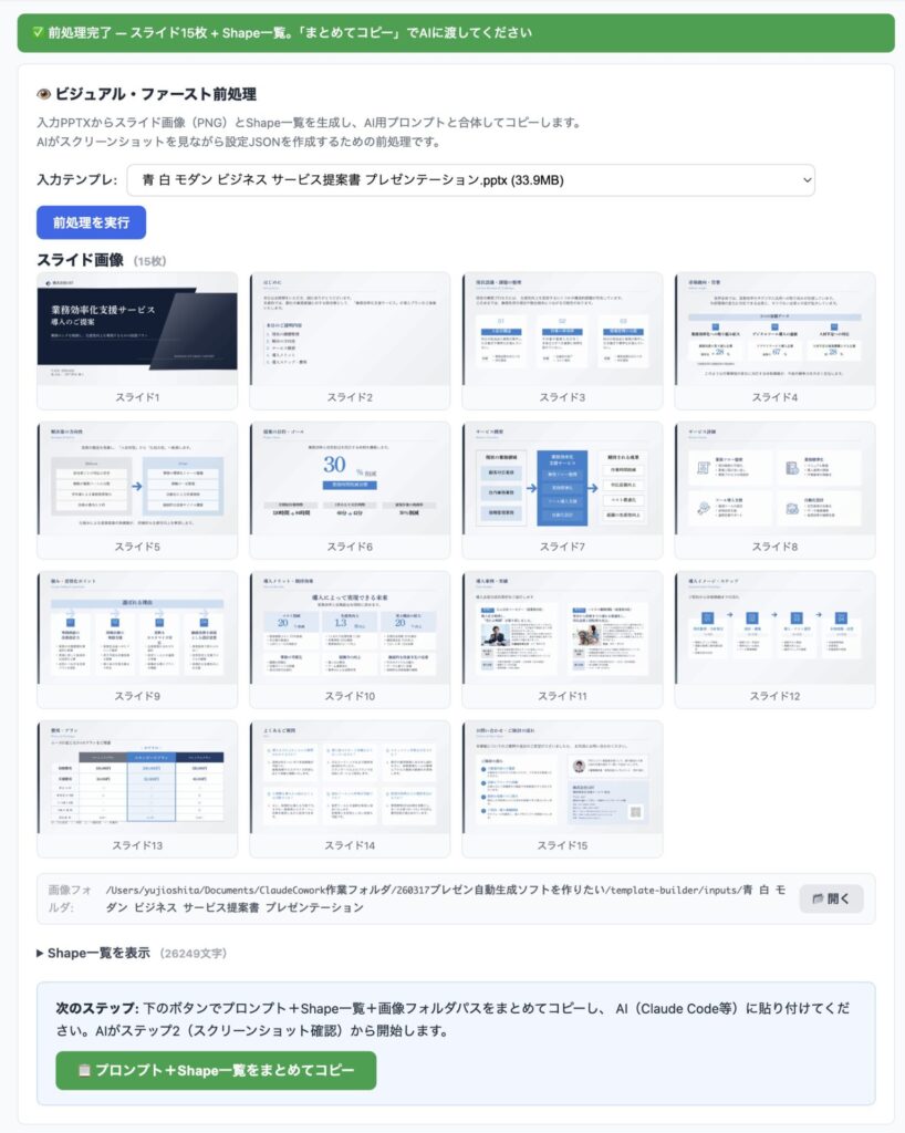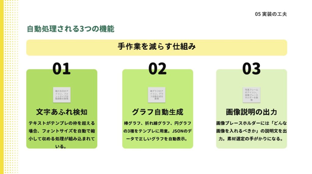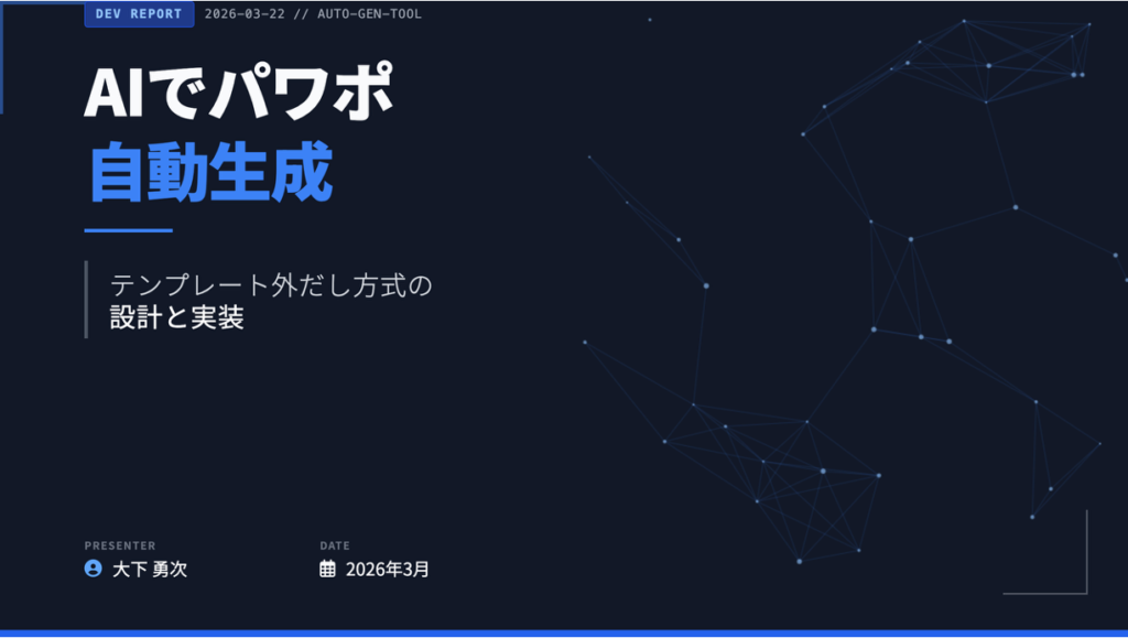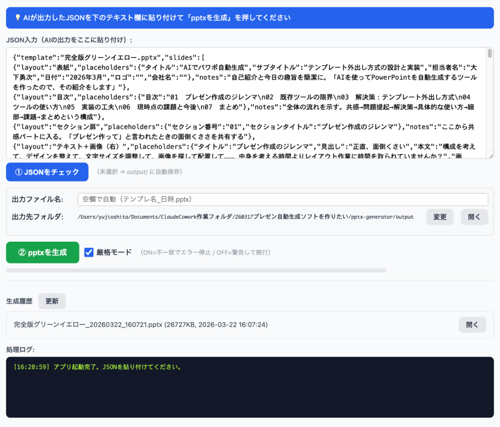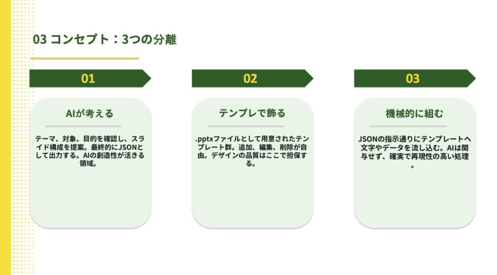 ツールの仕事: AIが出力したJSONを読み取り、テンプレートのプレースホルダーを機械的に置換して、完成したPowerPointファイルを出力する。ここに「考える」要素は一切ない。