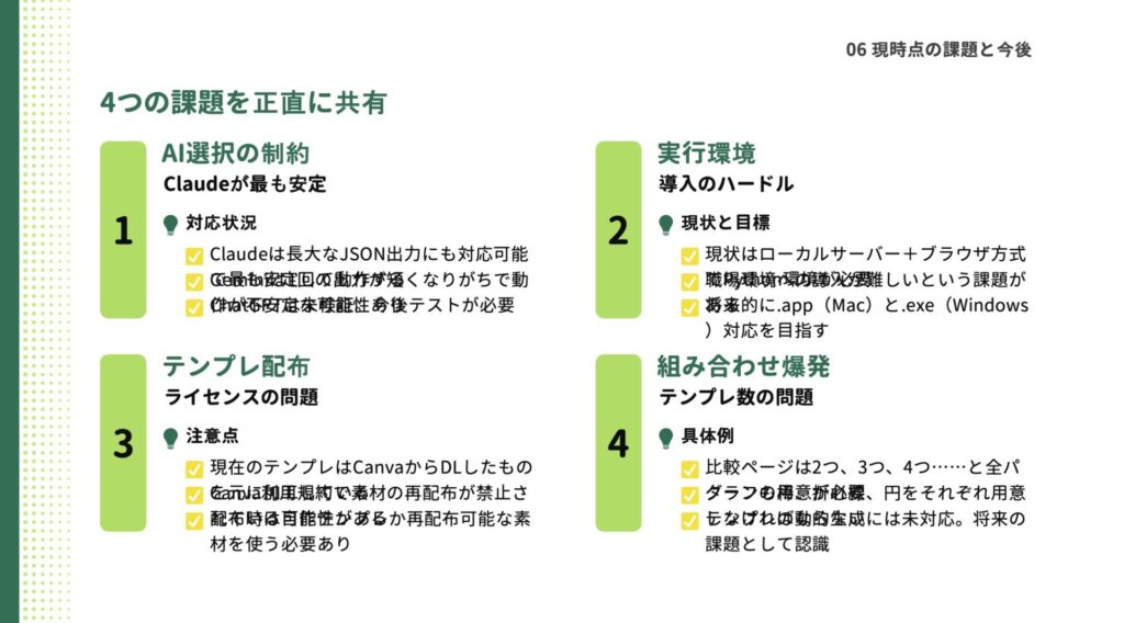テンプレート作成にはLibreOfficeが要る(PPTXから画像への変換に必要)し、補助ツールを使ったテンプレ作成はClaude契約が前提になる。あと今整備したテンプレートの元データがCanvaのデザインなので、権利関係でそのまま配布はできない。