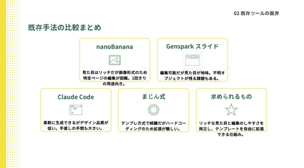 何が問題かというと、「見た目がリッチなプレゼンを作る方法」と「後から編集できるファイルで出力する方法」が、両立しないのだ。片方を取ればもう片方が犠牲になる。ずっとこのジレンマを抱えてきた。