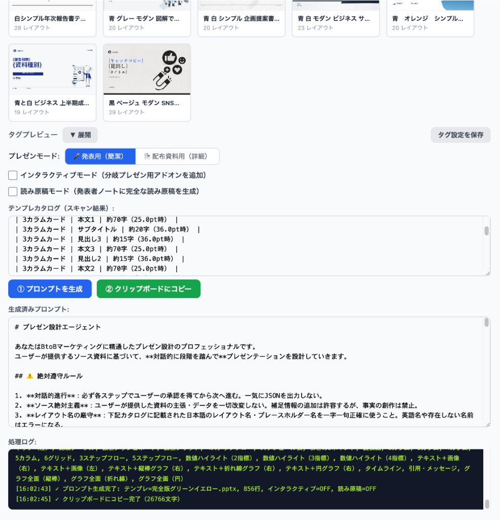 インタラクティブプレゼンだと、途中のページで選択肢を表示して、押されたボタンに応じて飛ばすスライドを考えるので、骨子の設計が変わるからプロンプトをそれ用に差し替えてる。