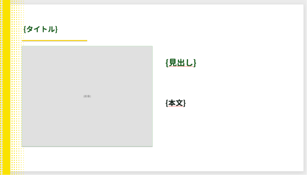 テンプレートの仕事: 見た目のデザインを担当する。事前にPowerPointファイルとして用意しておく。各スライドの中に{タイトル}とか{本文}のようなプレースホルダーを置いておく。