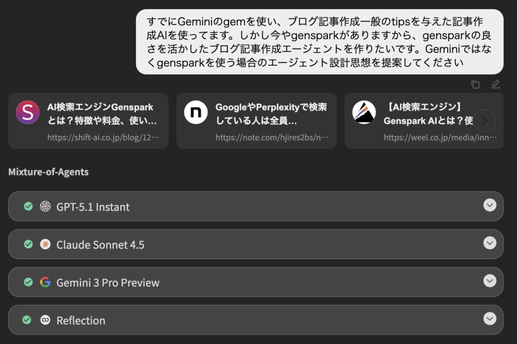 GenSparkの何が感動したかって、Mixture of Agents(エージェントの組み合わせ)っていう機能です。AIスライド作成機能も結構気に入ってるんですが、Mixture of Agentsは課金する時意識してなかったけど思いのほか良かった。