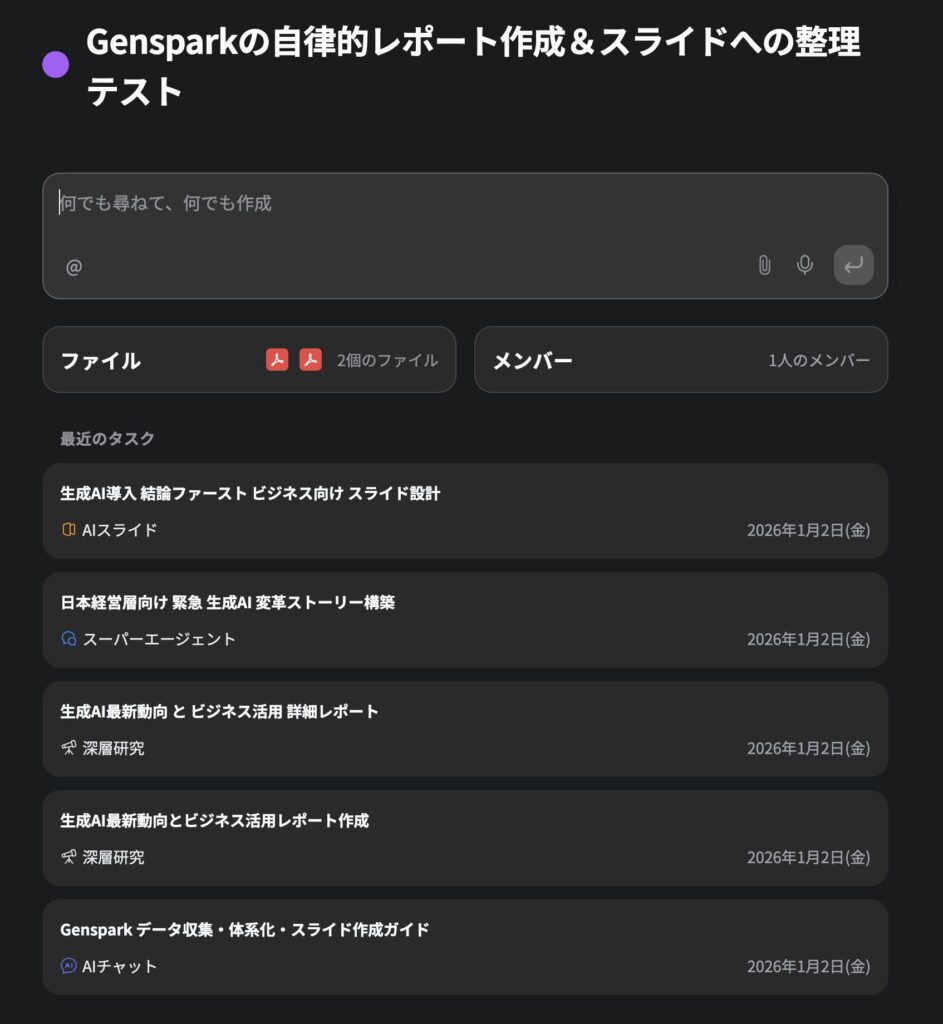 これまでの「AIというツールを使っていました」っていう感覚から、「GenSparkっていうワークスペース上で作業してる」みたいな感覚になりました。