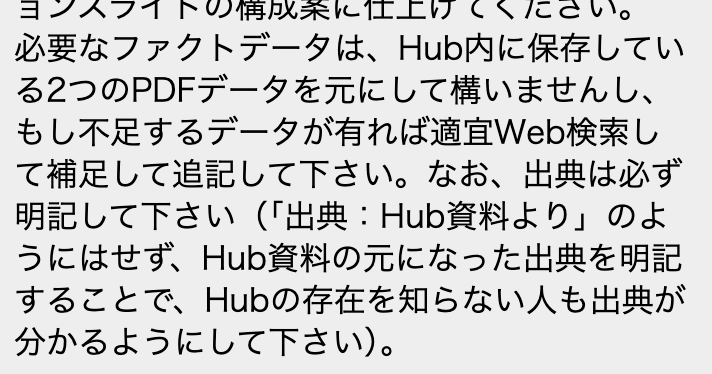 みたいなのを全部入れておく。 そうすると、後からスライドを作る時に「同じハブの中にあるディープリサーチの結果を踏まえてストーリーを作って」って言えば、いちいち結果を添付しなくても勝手に参照してくれる。
