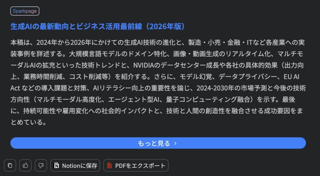 GenSparkで「ディープリサーチ」を実行すると、Sparkページっていう、ディープリサーチの結果をまとめた1ページの簡単なブログ記事みたいなやつを出してくれる。