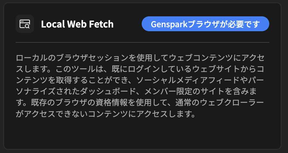 GenSparkには「ローカルWeb Fetch」っていう機能があるみたいで、これを活かせないかなと考えてます。
