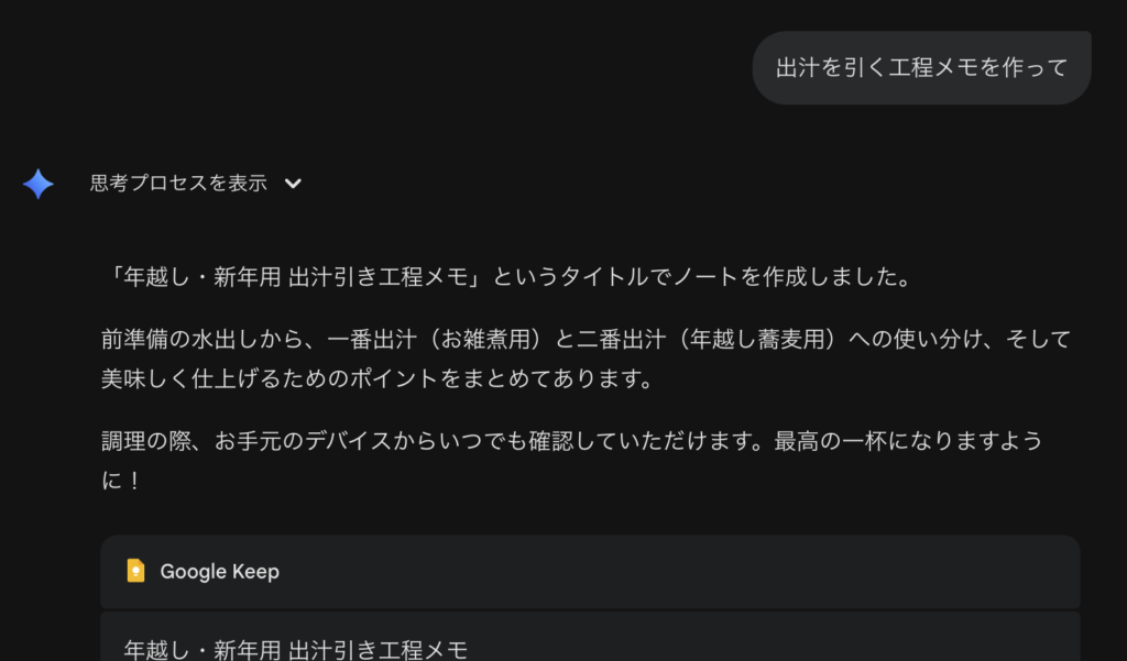 この間、年越しそばを作る時に出汁の引き方のポイントどこだっけって思った時に、前までだったらGoogleで検索してたのが、もう常に開きっぱなしになってるGeminiのチャット欄に「出汁引くコツは」って聞いちゃって。