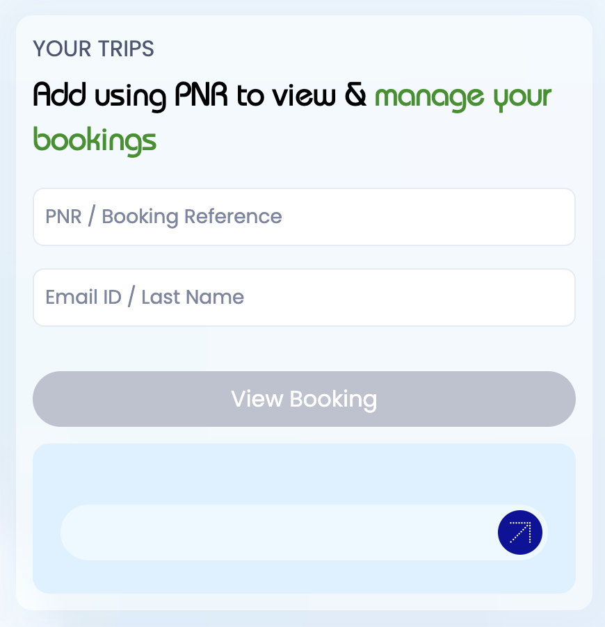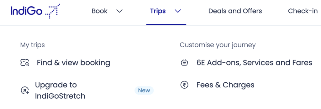最初、PC(Mac + Google Chrome)でIndiGo公式サイトにログインして、「Trips」タブから「Find and View Booking」ページへ移動しました。