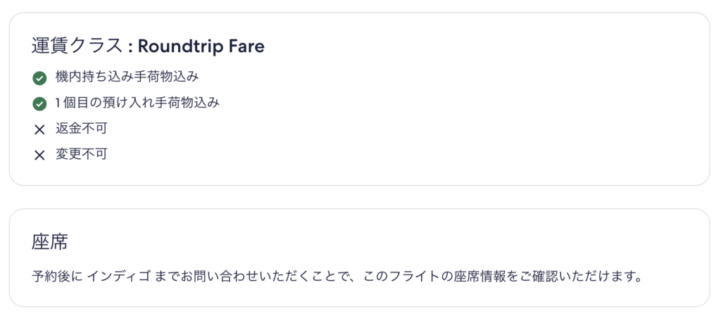 IndiGo便を予約しようとしたら、「通常料金(Roundtrip Fare)」と「Flexi料金」がありました。 今回ExpediaでIndiGo便を予約する際にはFlexi料金を選んだんですが、Expedia上では「座席指定不可」って表示が。