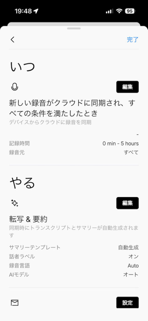 アプリ設定でAutoFlowを設定しておくと、録音データのクラウド同期から文字起こし、要約生成までを全自動でやってくれる。