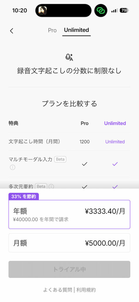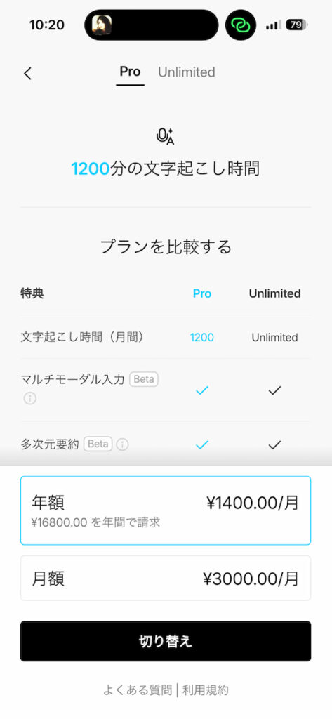 PlaudのAI機能を使うにはプラン加入が必要。無料のスタータープランは月300分(5時間)しかないので、仕事で使うなら月1,200分(20時間)使えるプロプラン一択になる。