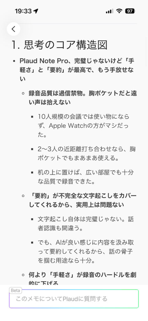 文字起こし自体は間違っていても、AIが良い感じに文脈を汲み取って、内容を補完して要約してくれる。「会議で何が決まったか」「何をしなきゃいけないのか」といった骨子を見返す用途なら、この要約だけで十分達成できる。 ネクストアクションの部分は、AIが勝手にやんなくて良いことも列挙してきがちだけど、それはPlaud note proが悪いというよりAIのクセなのでしゃーない。