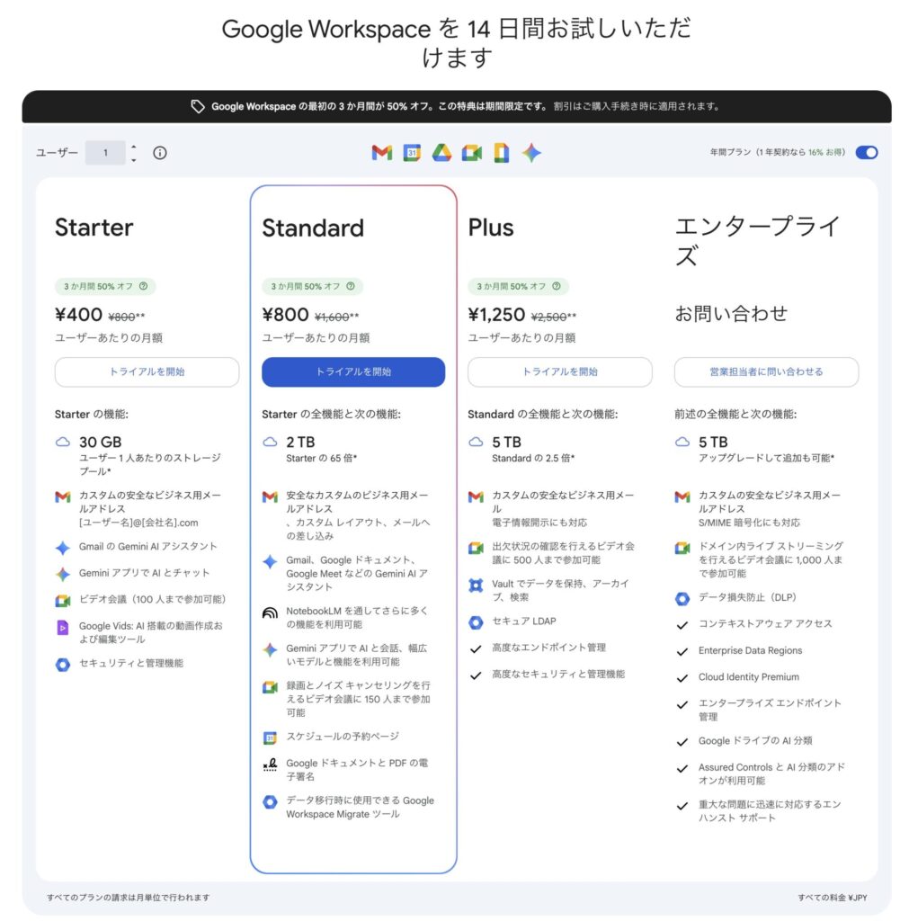 私が使ってるのはGoogle Workspace Business Standardで、月1,900円。個人でAI課金すると月2,900円。毎月1,000円浮く