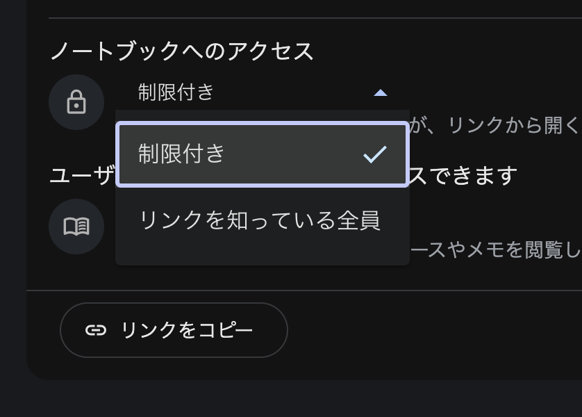 Google Workspaceで作ったNotebook LMだと、そもそも「制限付き」とか書いてあるアクセス設定が存在しない。
