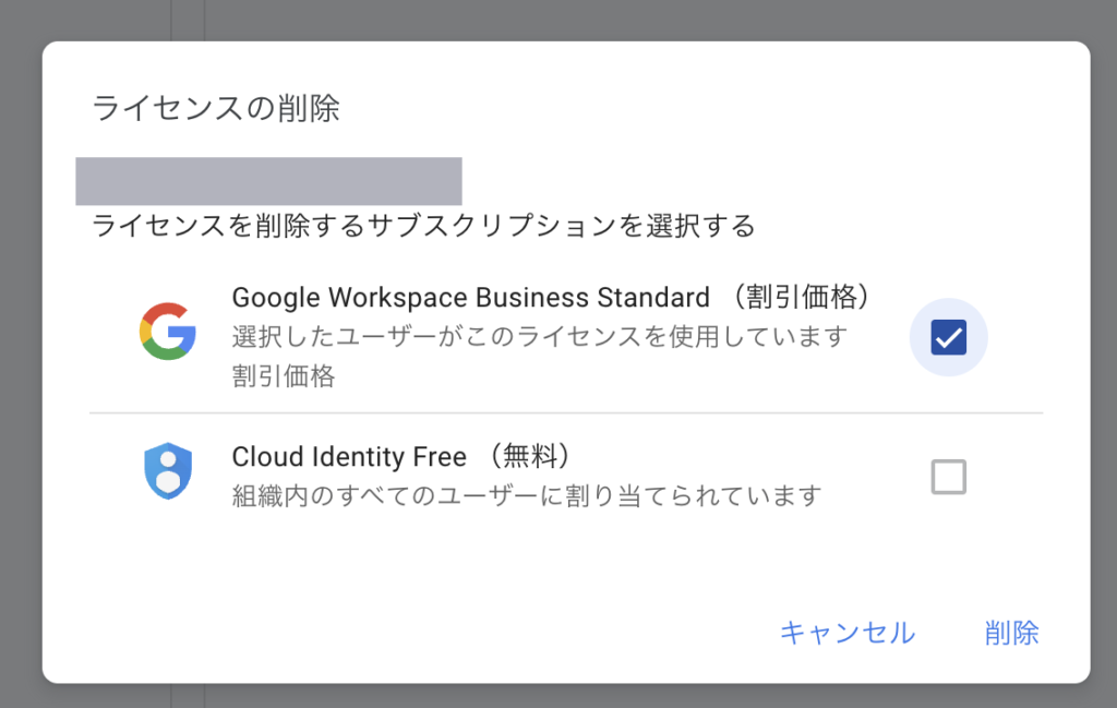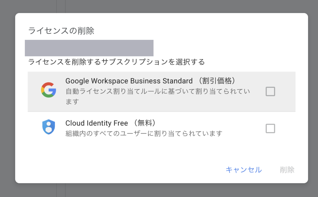 ところが私の場合、新規ユーザーに勝手にWorkspaceライセンス(Business Standard)が付与されて、外そうとしてもチェックボックスが外せませんでした。