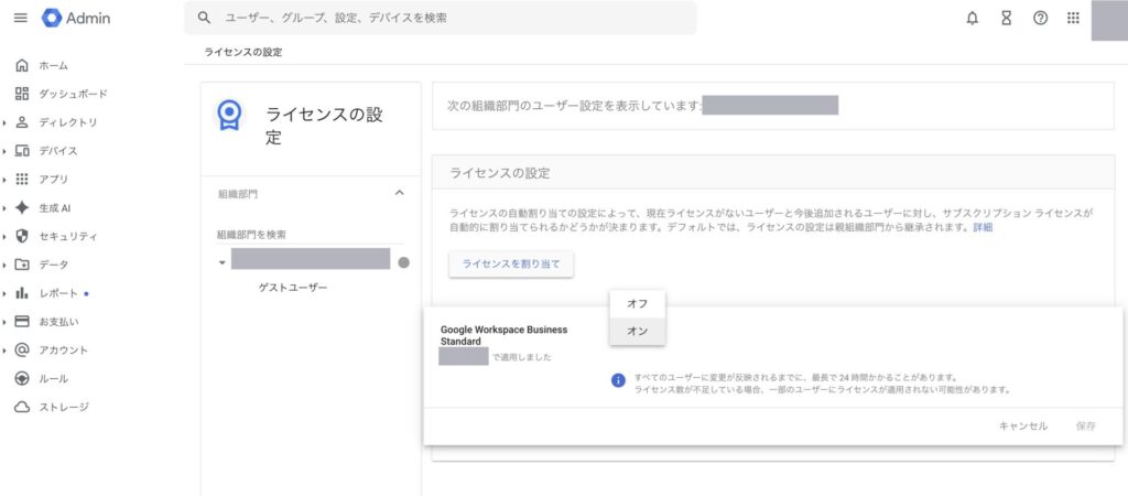 保存したらページをリロードして、またユーザー画面に戻って、今度こそゲストユーザーからWorkspaceライセンスを削除。無事外れました。