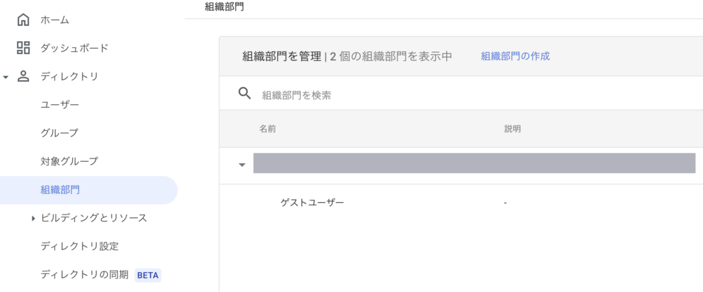• 「ディレクトリ」→「組織部門」 で、ルート直下に「ゲストユーザー」部門を作成