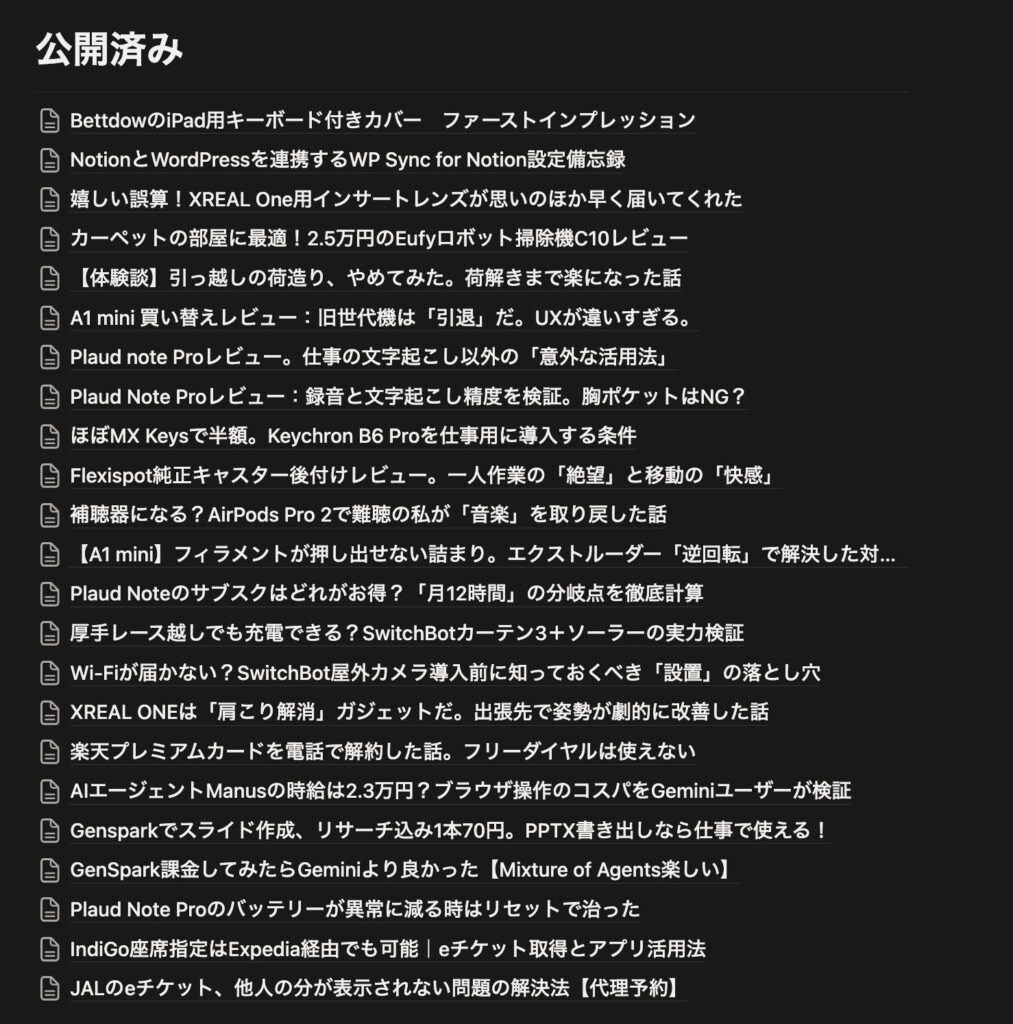 Addのみにしているので、Notion側をいじっても同期されませんが、このページは完全に自分用のメモが置いてあるだけなので、WP側で公開にしちゃわないよう注意です。