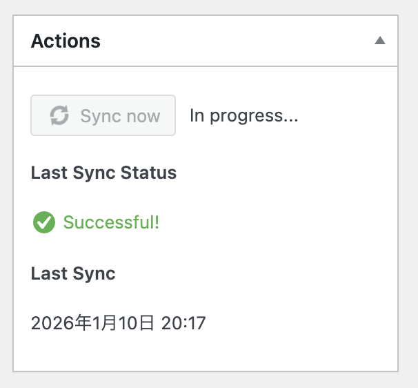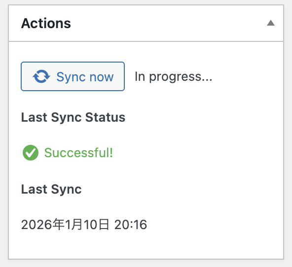 画面右側にあるActionsから、Sync nowボタンを押せば、指定したページ自体と、その子ページが下書きとして追加されます。 なお、Sync nowがグレーアウトしている場合、上に書いた「公開(=設定を保存)」が未完了だと思うので、先に公開してください。